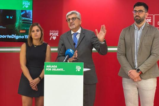 10/06/2025 - Isabel Pérez, Josele Aguilar y Daniel Gómez en rueda de prensa en Málaga sobre movilidad