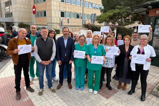 Daniel Pérez, Carmen Martín y Jorge Quero en la puerta del Hospital Materno Infantil con sanitarios, tema aparcamientos y sanidad pública