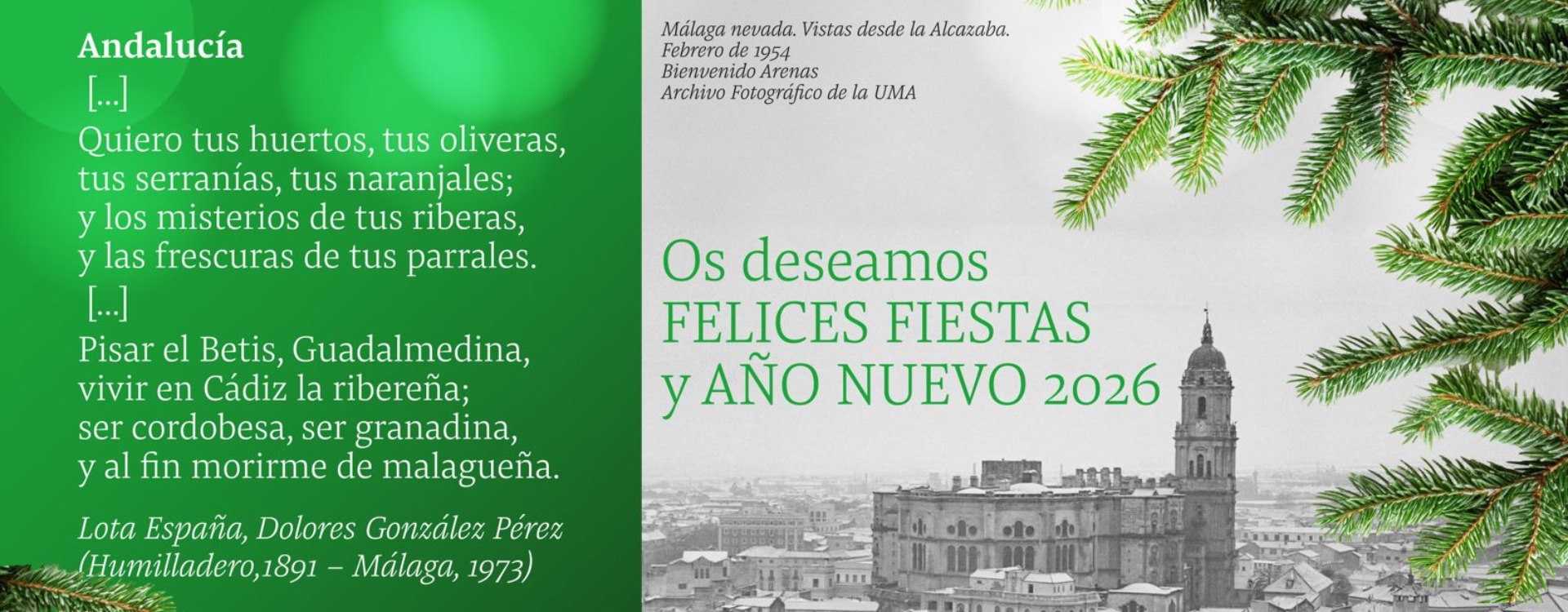 En la felicitación navideña, los versos de la poetisa malagueña se acompañan de la imagen "Málaga nevada. Vistas desde la Alcazaba", tomada en febrero de 1954 por Bienvenido Arenas y procedente del Archivo Fotográfico de la Universidad de Málaga.